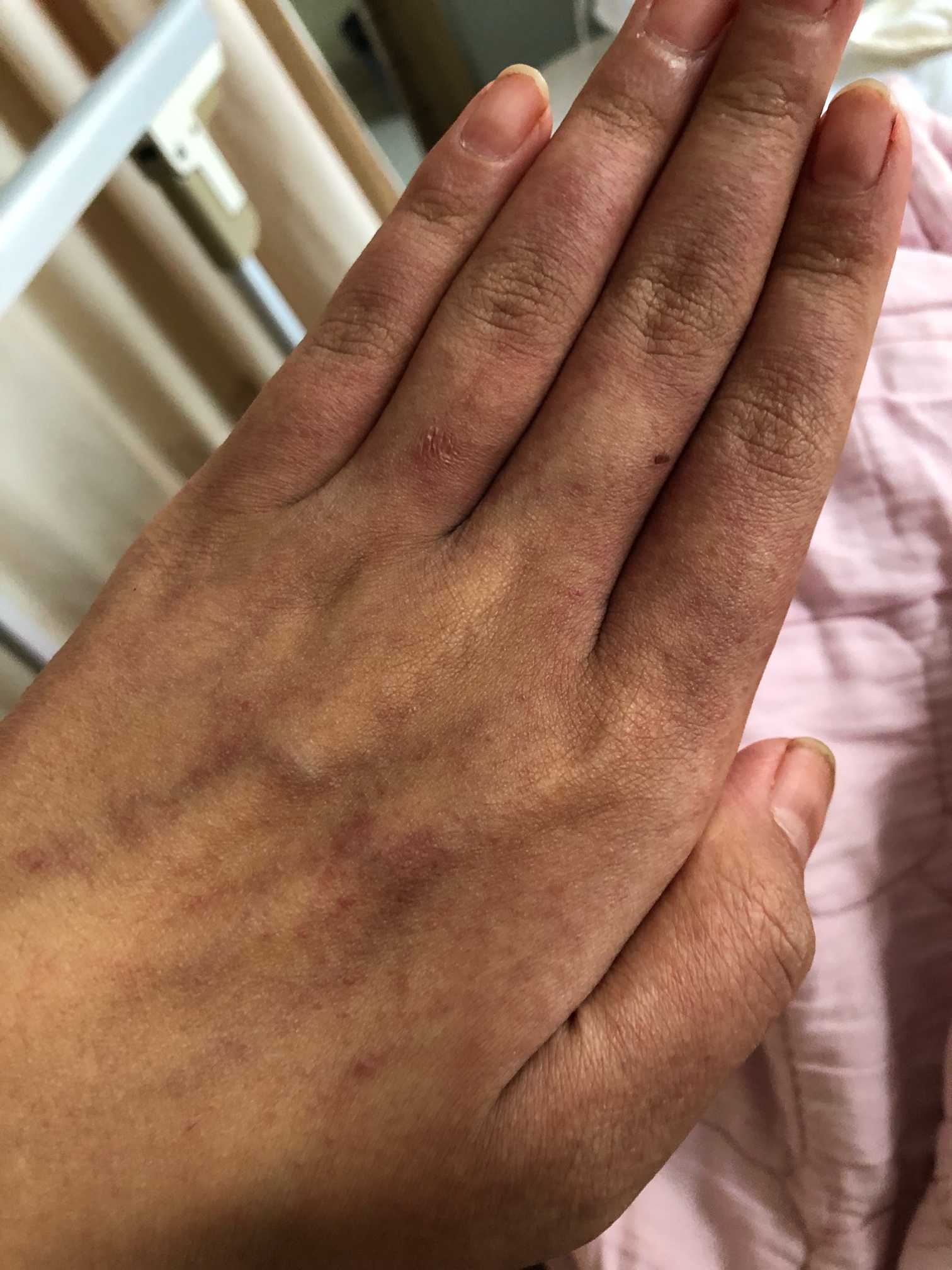 不痛不痒 越来越密 散布在手部脚部躯体