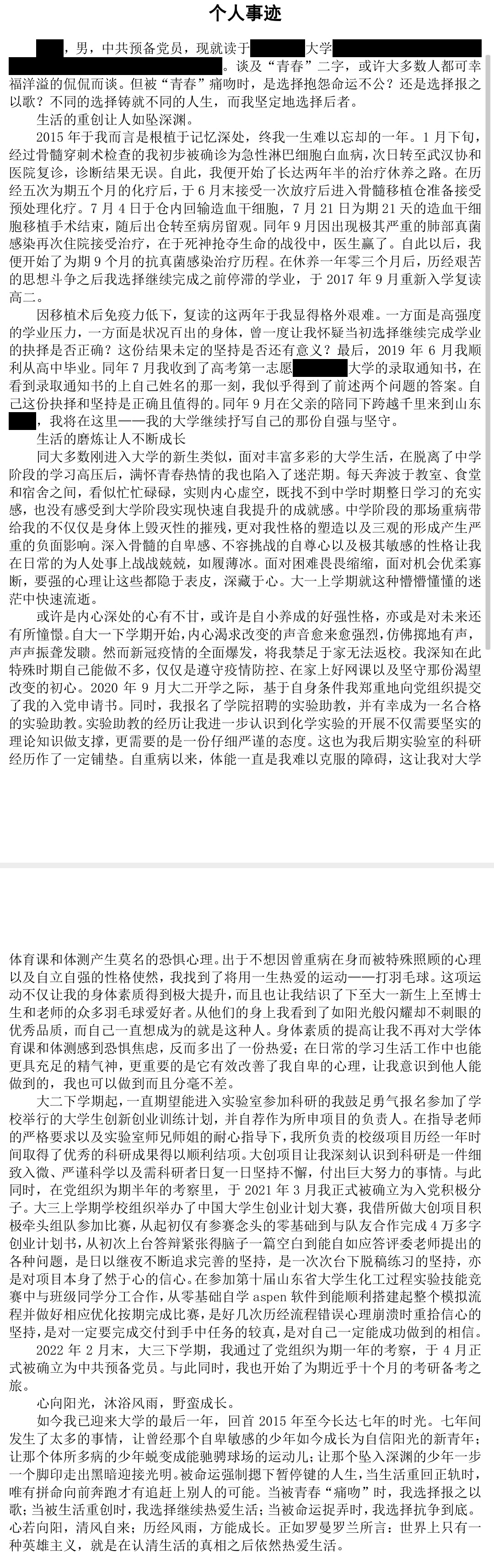 一来,我写下这篇文章是按照参选校园感动人物的材料要求写的,因为材料要求1000字左右,结果我写了接近2400个字。因为一直想着字数的要求,所以我仅仅写出了大致的经历,很多细节没有展开写就直接省略了。