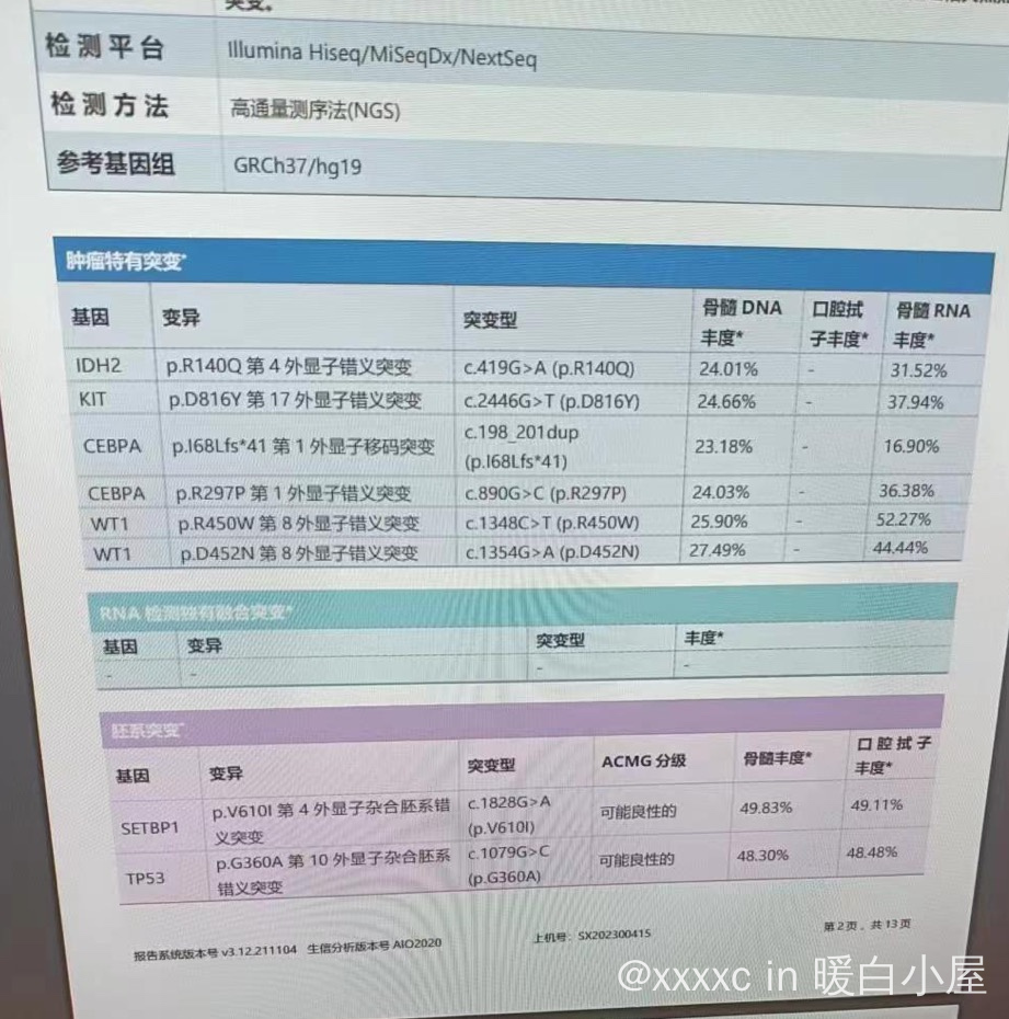 xxxxc 发表于 2023-04-28 05:40 图二就是复发后做的基因检测。这次化疗用了恩西地平。化疗七天后做了骨穿,流式显示还有2%。我是比较担心移植医生说的:化疗复发的患者就算移植后的复发率也比一般患者高。心里没底。