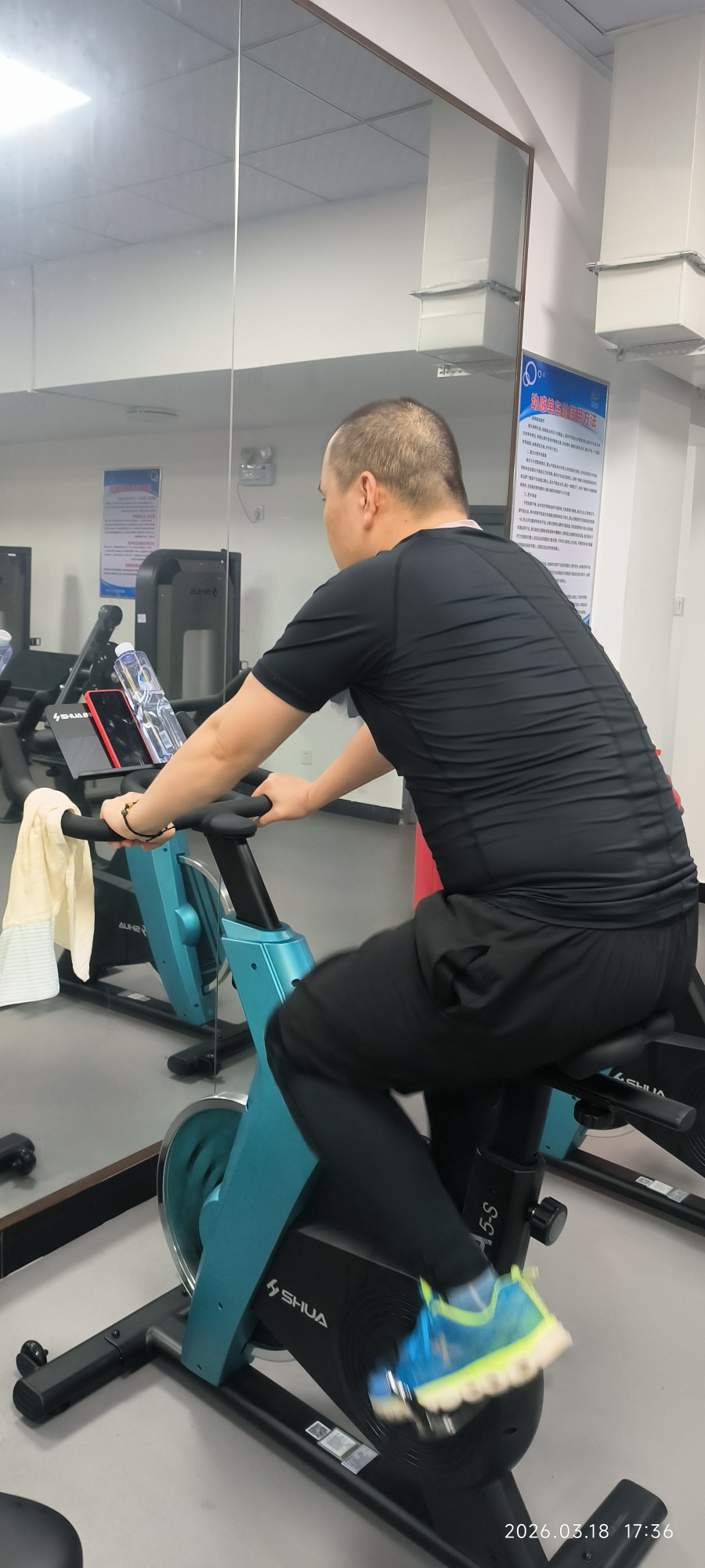 四年多了,第一次进入健身房锻炼,身上的肥肉一圈圈,先进行简单的单车锻炼,爬坡走了十分钟,单车骑了十分钟就气喘吁吁,有肺排,不能进行大力量的撸铁,选序渐进吧!加油