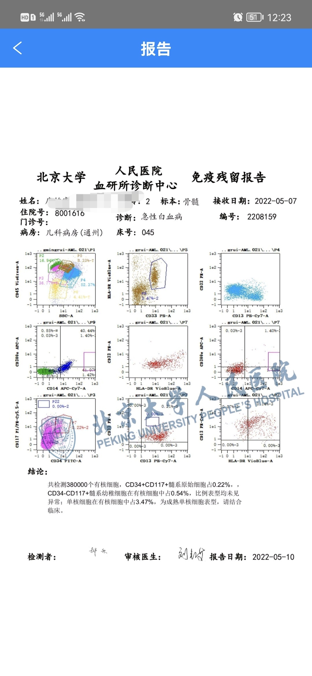 未见异常,或者是未见明显异常,表示没有检测到异常细胞,或者低于检测标准,具体还要根据基因定量这两个来判断,单独这个残留未见,说没残留,也没毛病。骨穿,或者是外周血,只是一个检测的片段而已。