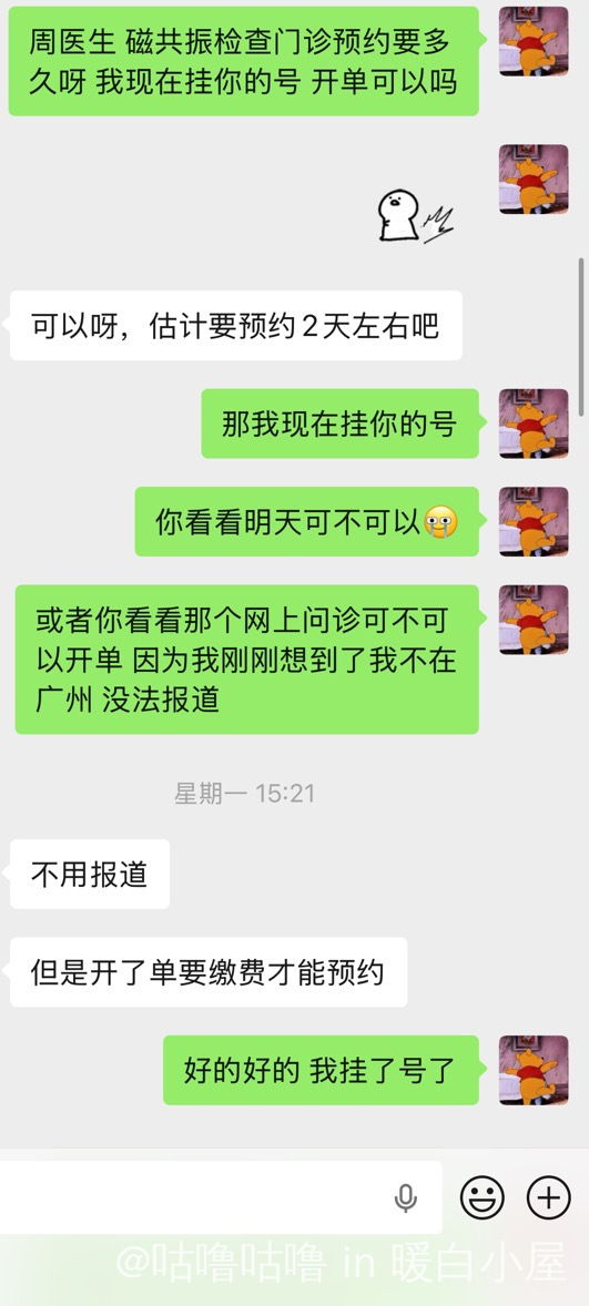 由于我的右脚内侧一直疼 大概有一个月左右吧 情况有好转 没有像刚开始那么痛 然后这中间我也有去看过骨科 医生说因为走路太多导致的 又或者是筋拉伤了 于是就想着去拍一个磁共振 但是由于报销问题 我还是选择了去我的移植医院照 但是当时我又不在广州 听说磁共振要预约 我就发信息给了我的主治 问能不能挂她的号预约 主治非常好 找了个人帮我去约 表白亲爱的周医生!! 然后就这样等了几天 就出发去拍磁共振 等了一天左右 结果就出来了 就是有点积液 心中像放下了一块大石头一样 但是医生说要多休息 尽量不要做高强度的运动