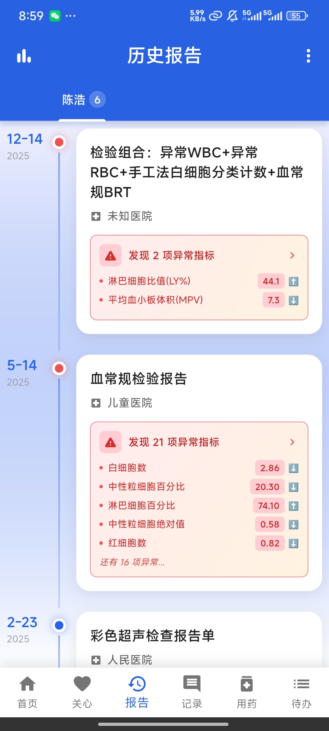 8.所有报告自动按时间线,按病人名称归档排列,波动曲线直观显示指标变化。